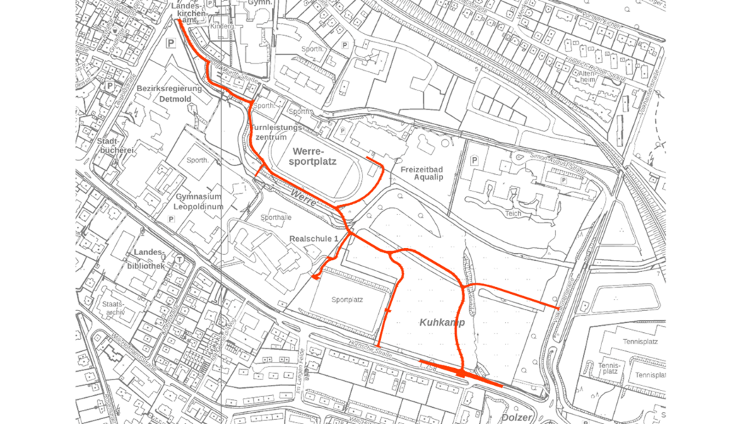 Trittstein Kuhkamp Detmold: Schülerprojekt zur Umgestaltung der Werre in Detmold | Planungsraum wasserwirtschaftliche Maßnahmen | Übersichtkarte mit Darstellung der Wegeplanung | Bilder: Stadt Detmold