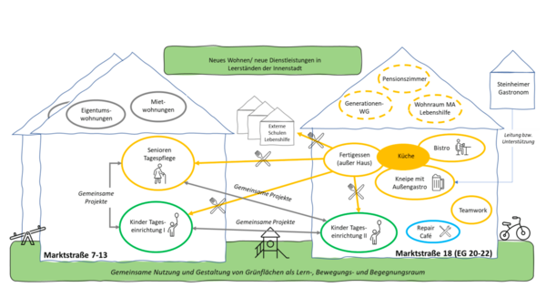 In den Erdgeschossen entstehen Angebote für mehrere Generationen. Dazu zählen eine Tagespflege und ein Kindergarten mit einem öffentlichen Gemeinschaftsraum und einem Generationengarten. Auf diese Weise gewinnt das Stadtzentrum soziale Funktionen, Publikumsverkehr und Leben im öffentlichen Raum. Zugleich erhöht sich die Besucherfrequenz mit potenziellen Effekten für Handel und Dienstleistung. In den Obergeschossen entstehen insgesamt 19 Wohnungen zwischen 48 und 112 Quadratmetern, die sich überwiegend für kleinere Haushalte eignen und zur Miete angeboten werden. Im rückwärtigen Bereich werden begrünte Außenanlagen geschaffen.