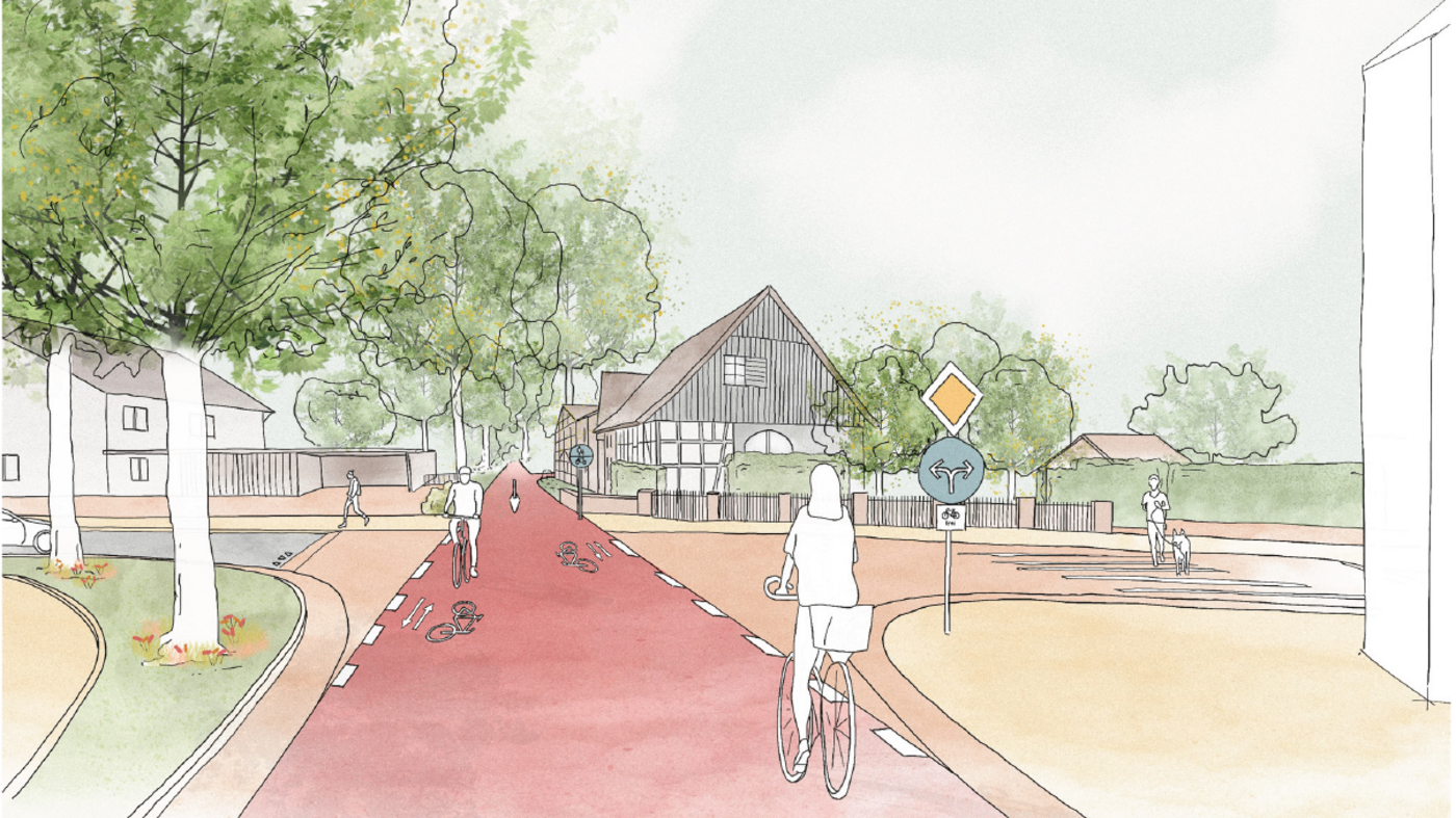 Innerhalb der Ortschaften wird das Konzept ebenfalls auf die Förderung des Radverkehrs und die Reduzierung des Kfz-Verkehrs ausgerichtet. Hier wird eine gemeinsame Nutzung der Straßen durch Rad- und Kfz-Verkehr angestrebt, um den Verkehrsfluss zu beruhigen und Nahmobilität zu fördern. Auf Hauptverkehrsstraßen werden, vor allem in Abschnitten mit Tempo 30, Piktogrammketten markiert, um den Radverkehr vom Fußverkehr zu entflechten.