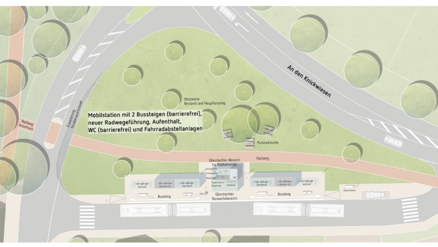 An einem verkehrsgünstig gelegenen Standort wird eine bestehende Haltestelle zu einer modernen Mobilstation ausgebaut. Diese Station bietet durch ihre gute Erreichbarkeit mit dem Rad und die Ausbaumöglichkeiten eine ideale Verknüpfung zum öffentlichen Verkehr. Der Linienbus verkehrt hier bereits im 15-Minuten-Takt in die Ortsmitte, zur Nachbarkommune und zum nächsten Oberzentrum.