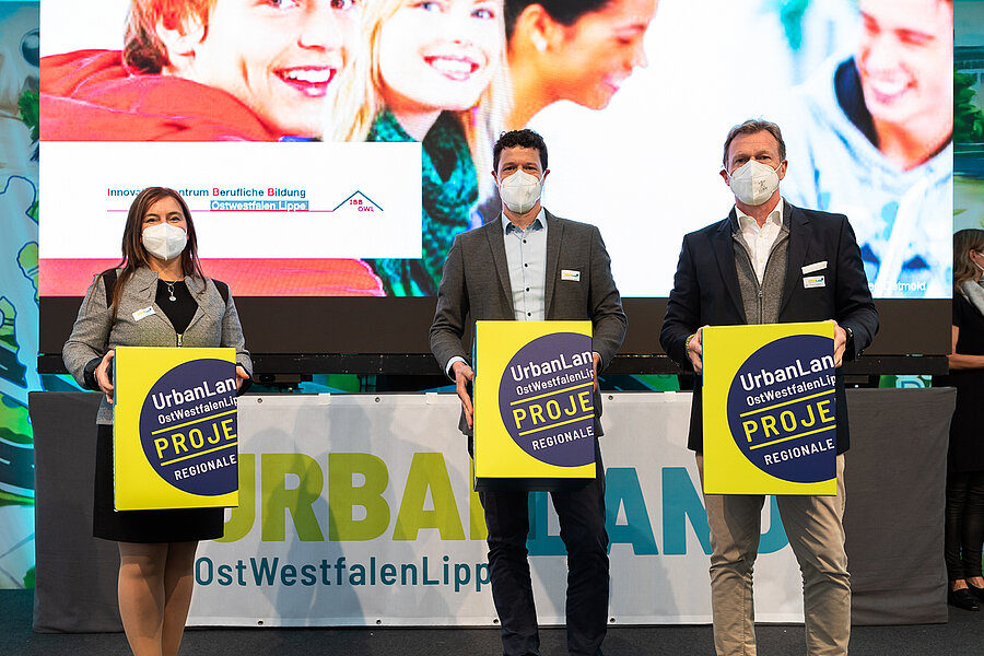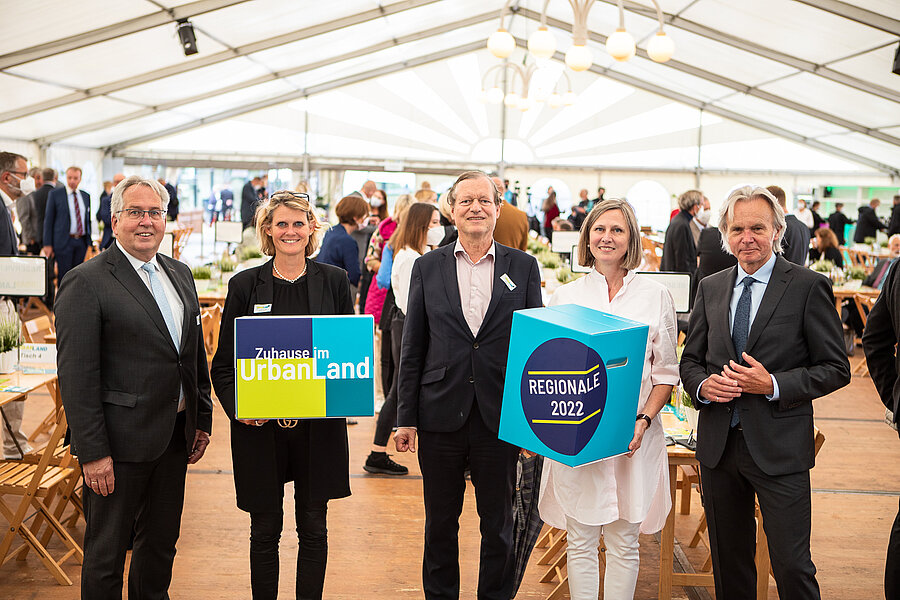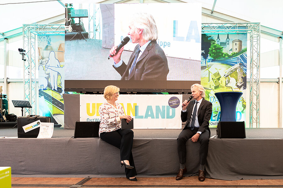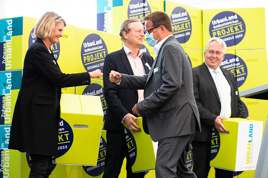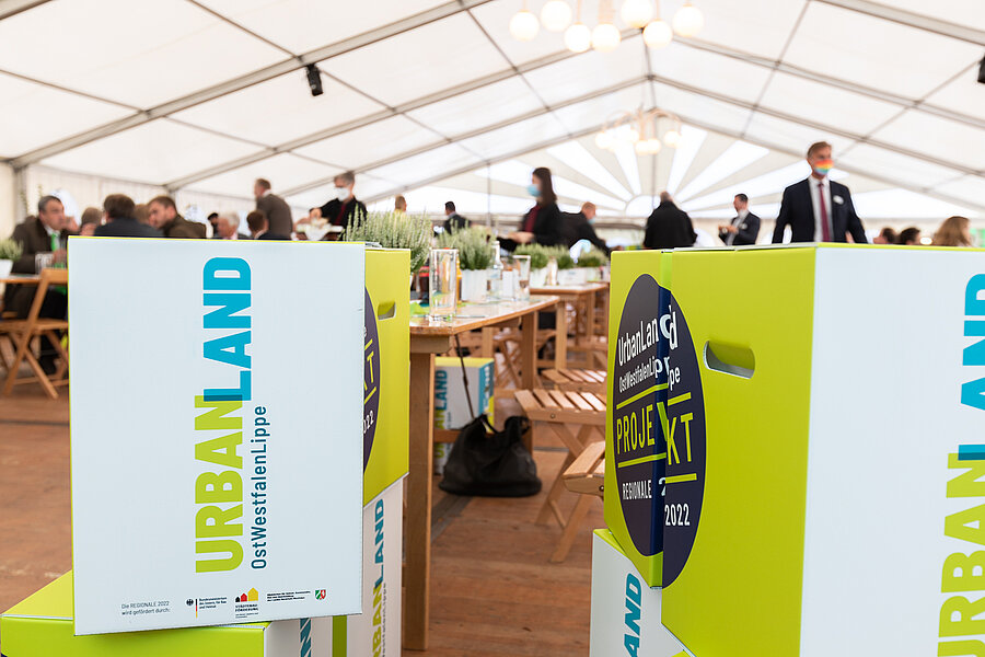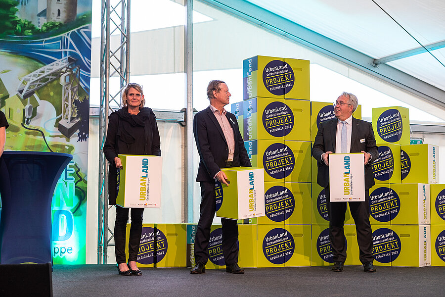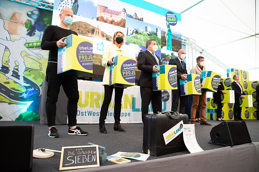 Hinter den REGIONALE-Projekten stehen starke Netzwerke, interkommunale Kooperationen und engagierte Menschen und Institutionen. Die Projekte des letzten Jahres – seit September 2020 – flankierten das Bühnenprogramm der UrbanLand Partie, wo in Interviews und Gesprächen Konzepte und einzelne konkrete Projekte vorgestellt wurden. Gemeinsam mit Regierungspräsidentin Judith Pirscher ehrten Landrat Jürgen Müller und Rudolf Delius, Vorsitzender der Gesellschafterversammlung der OWL GmbH, die Verantwortlichen der insgesamt 31 Projekte, die im vergangenen Jahr den sogenannten A-Beschluss erhielten. Ihnen wurde ein symbolischer Sitzwürfel für das UrbanLand OstWestfalenLippe übergeben.