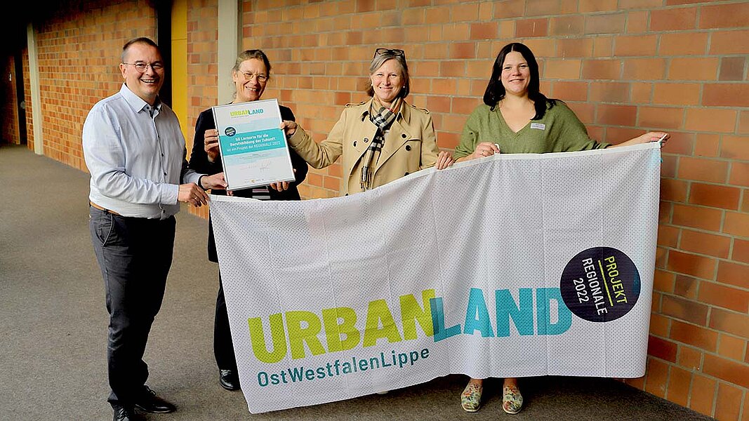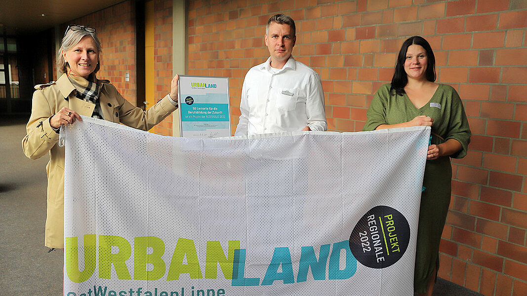 Zum Termin überreichte REGIONALE-Leiterin Annette Nothnagel Urkunde und Fahne als Auszeichnungselemente der REGIONALE 2022.
