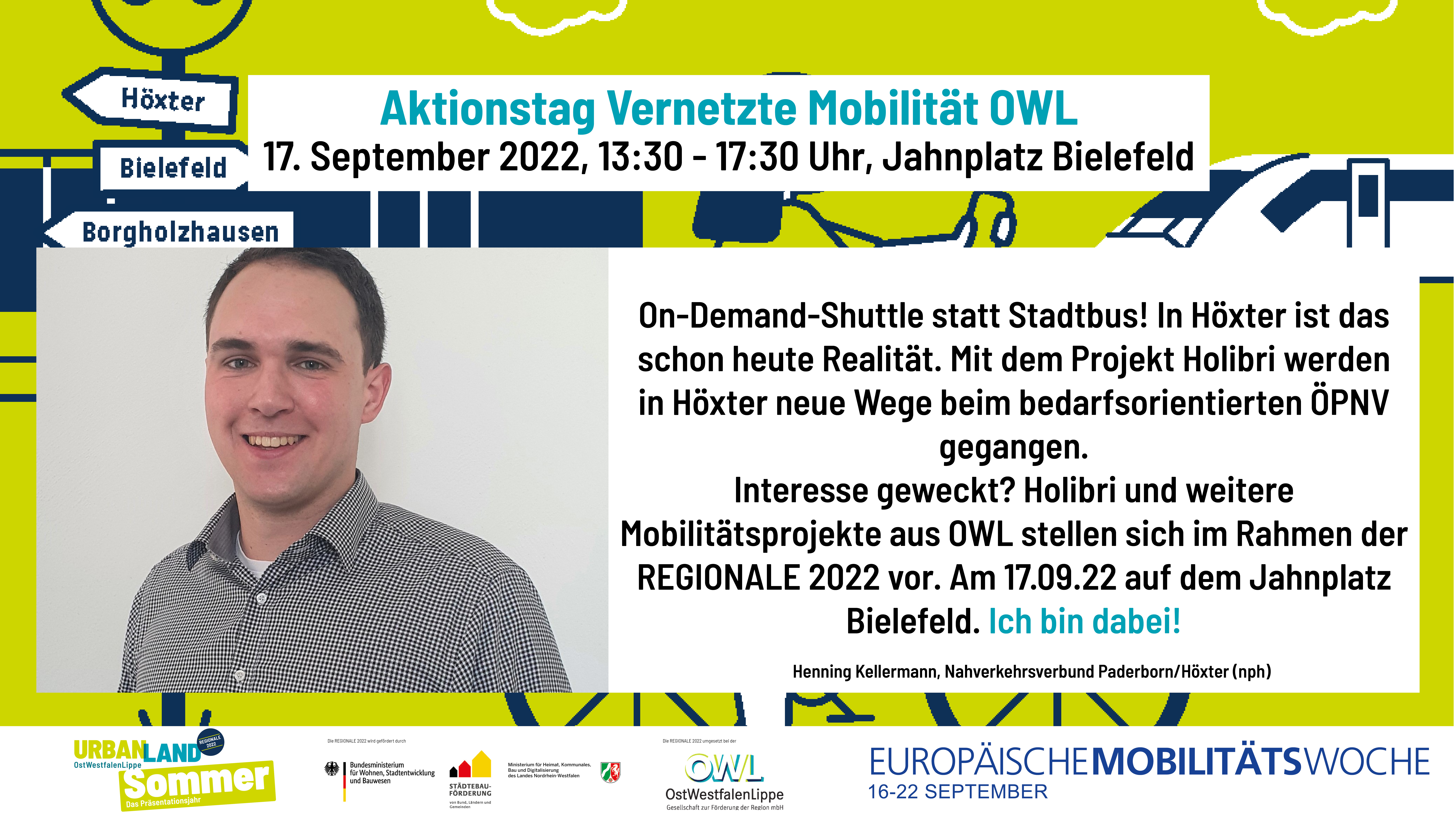 Mit On-Demand-Fahrzeugen lässt sich Mobilität deutlich bedarfsgerechter organisieren. Innerhalb der REGIONALE 2022 ist vernetzte Mobilität ein zentrales Thema für die gute Verbindung von Stadt und Land und somit ein Schlüssel für ein gutes Leben in der Region OstWestfalenLippe. Mit dem Aktionstag am 17. September 2022 stellten sich Angebote aus ganz OstWestfalenLippe auf dem Bielefelder Jahnplatz vor, die das Thema „Ankommen“ zum Ziel haben. Den Rahmen dafür gab die Europäische Mobilitätswoche vom 16. bis 22. September, die in diesem Jahr unter dem Motto „Besser verbunden“ stattfand.