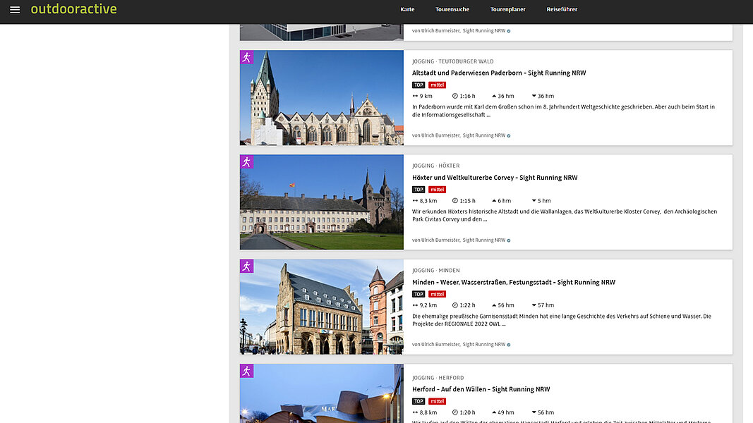 Laufend Baukultur erleben! - Unter diesem Motto können Läuferinnen und Läufer jetzt anlässlich des REGIONALE-Präsentationsjahrs 2022 in OstwestfalenLippe auf sieben Routen die Architektur der Städte und Gemeinden sowie die örtliche Baukultur auf neue Weise erleben. In Bielefeld, Detmold, Gütersloh, Herford, Höxter, Minden und Paderborn bietet „Sight Running NRW“ mit der App „Outdooractive“ die Möglichkeit, über einen GPS-gesteuerten Audioguide auf attraktiven Laufrouten mehr über architektonische Highlights, Stadt- und Landschaftsplanungen sowie über stadthistorische Hintergründe zu erfahren. Die Routen stellen dabei auch gezielt Projekte der REGIONALE 2022 vor, die sich in diesem Jahr unter der Überschrift „UrbanLand Sommer“ in OstwestfalenLippe präsentiert.